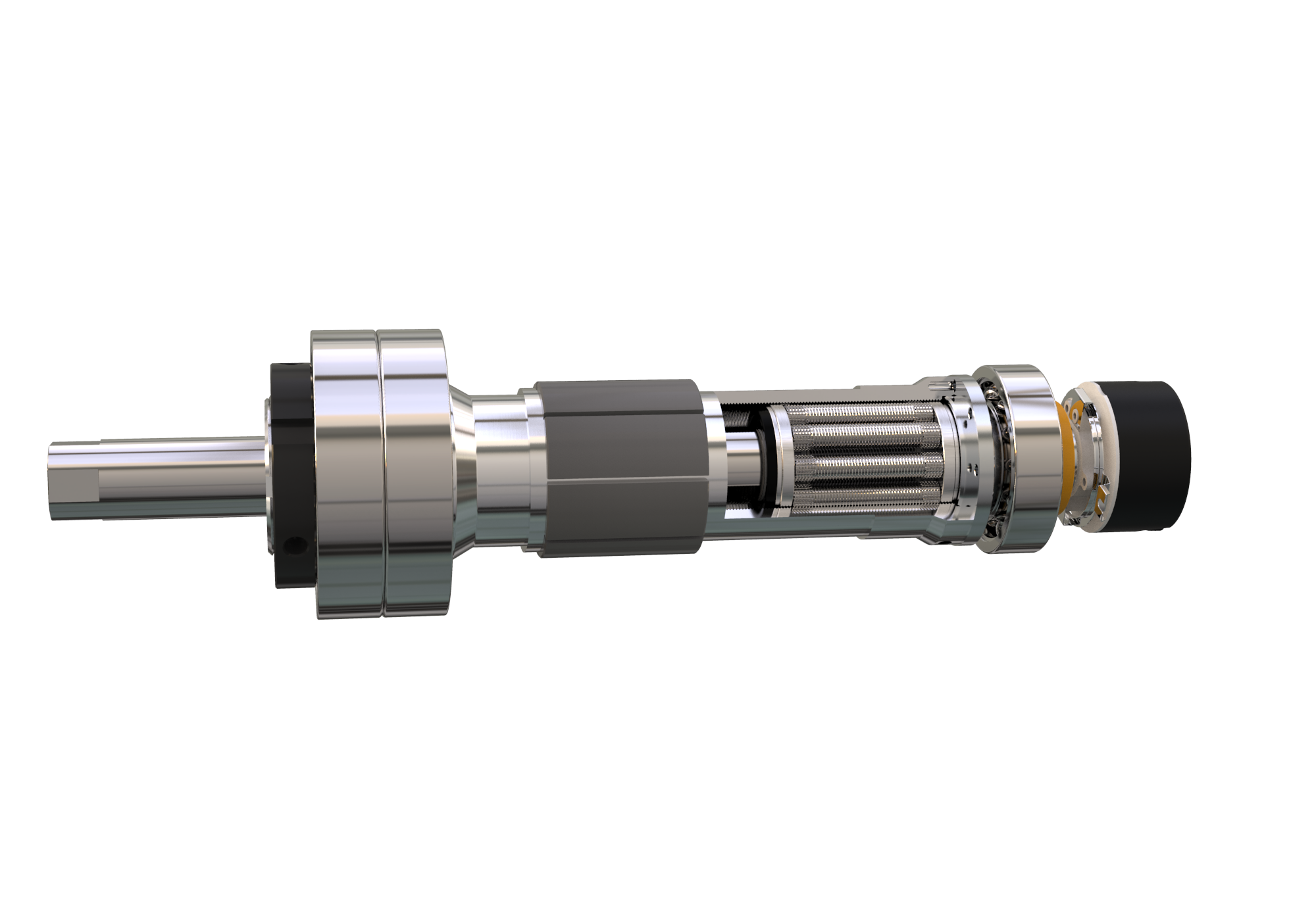 - 透过剖切开的转子套筒,我们看到了反置式行星滚柱组总成,滚柱的螺纹外侧与套筒内部螺纹咬合,而滚柱螺纹内侧和端侧齿牙与推杆上的螺纹和齿牙咬合;当转子套筒受力旋转,在上述螺纹齿牙的咬合作用下,行星滚柱丝杠总成在套筒内部来回运动,完成电缸推杆输出侧的推拉动作。